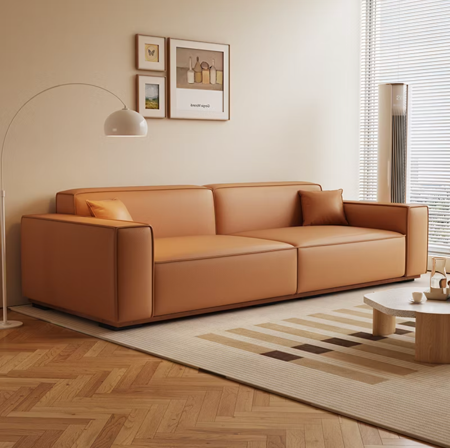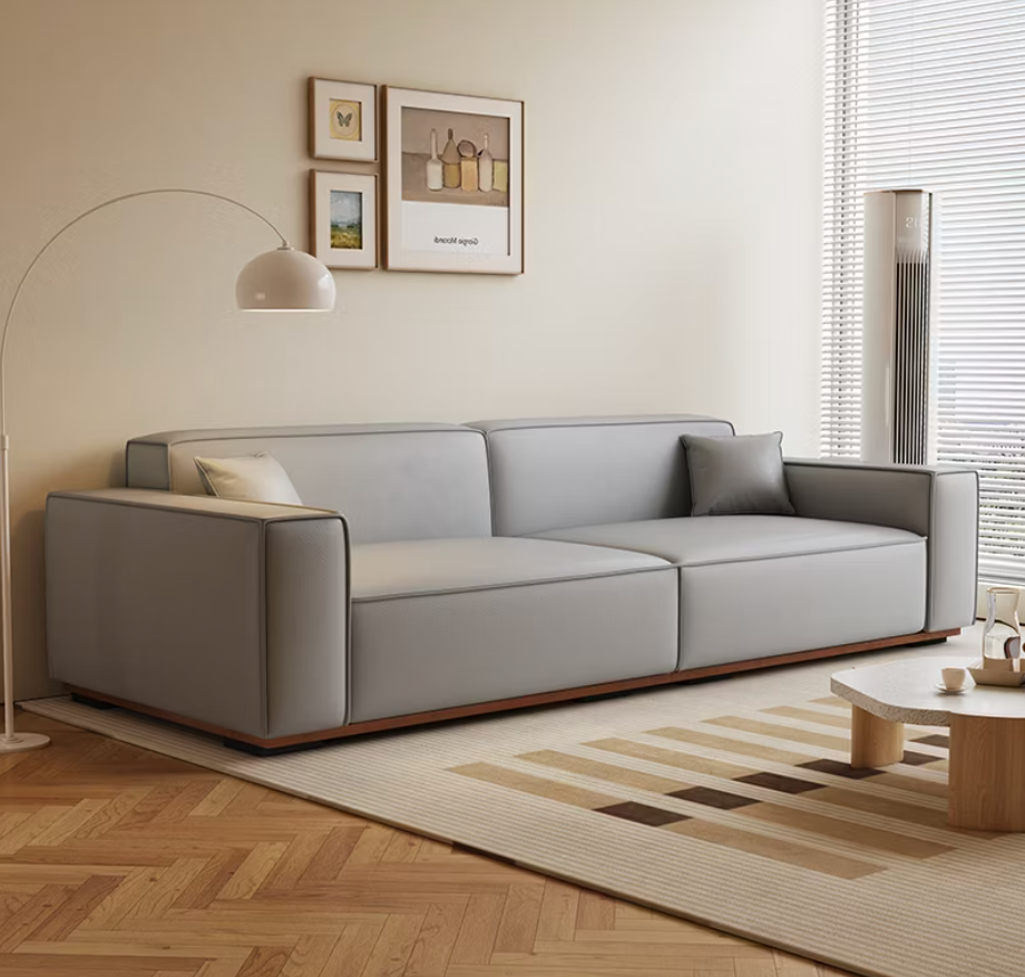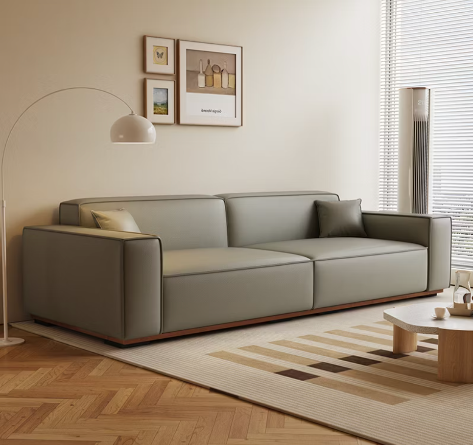 The Nox Sofa is quiet power in material form. Upholstered in supple midnight leather, it sits low and assertive, with clean geometry and a warm wooden base that barely lifts it off the ground — like it’s hovering in place. The squared-off arms and seamless cushions lend it a composed, architectural presence, while the silky texture offers understated luxury. Designed for those who see beauty in precision and elegance in silence, Nox is more than a seat — it’s a statement of intent.