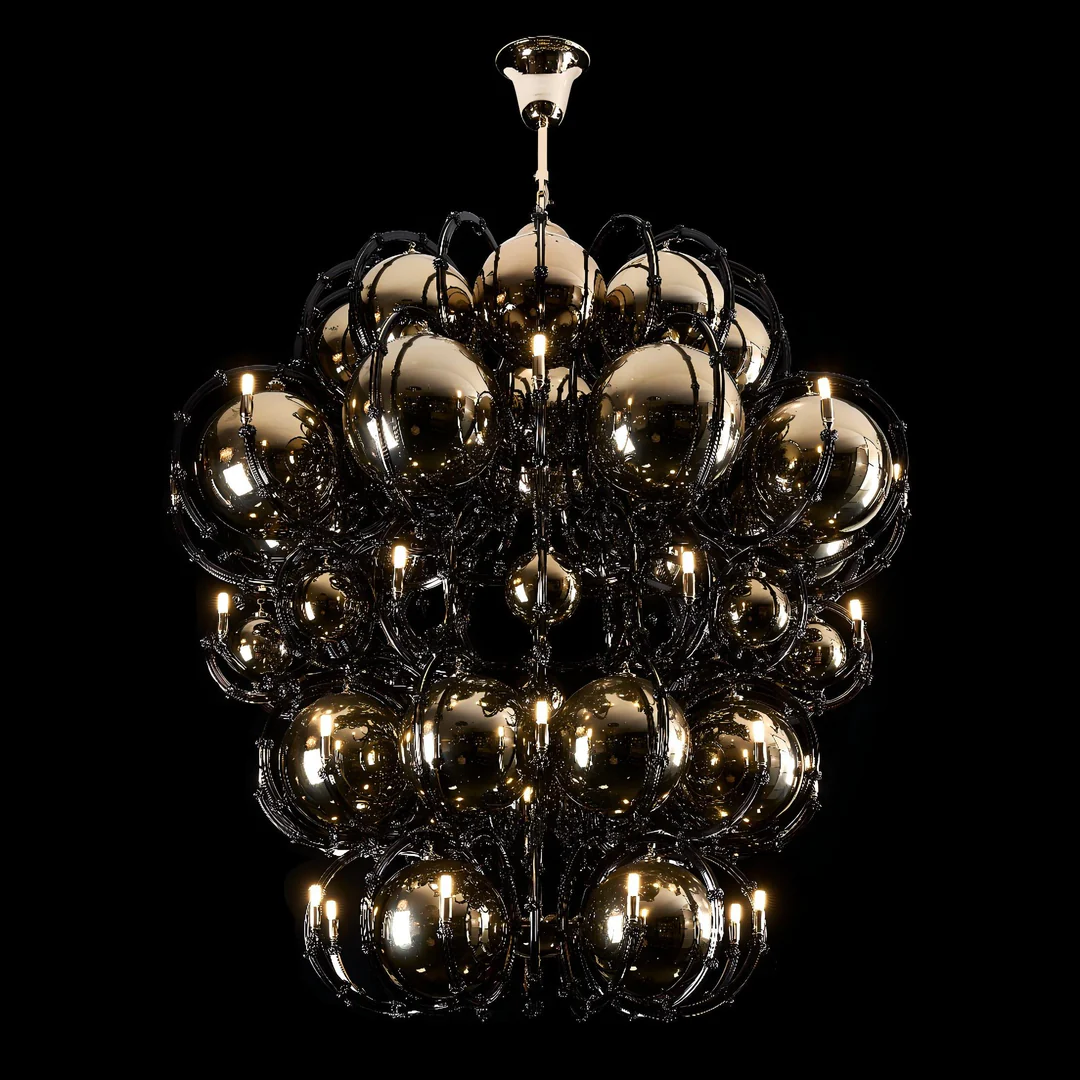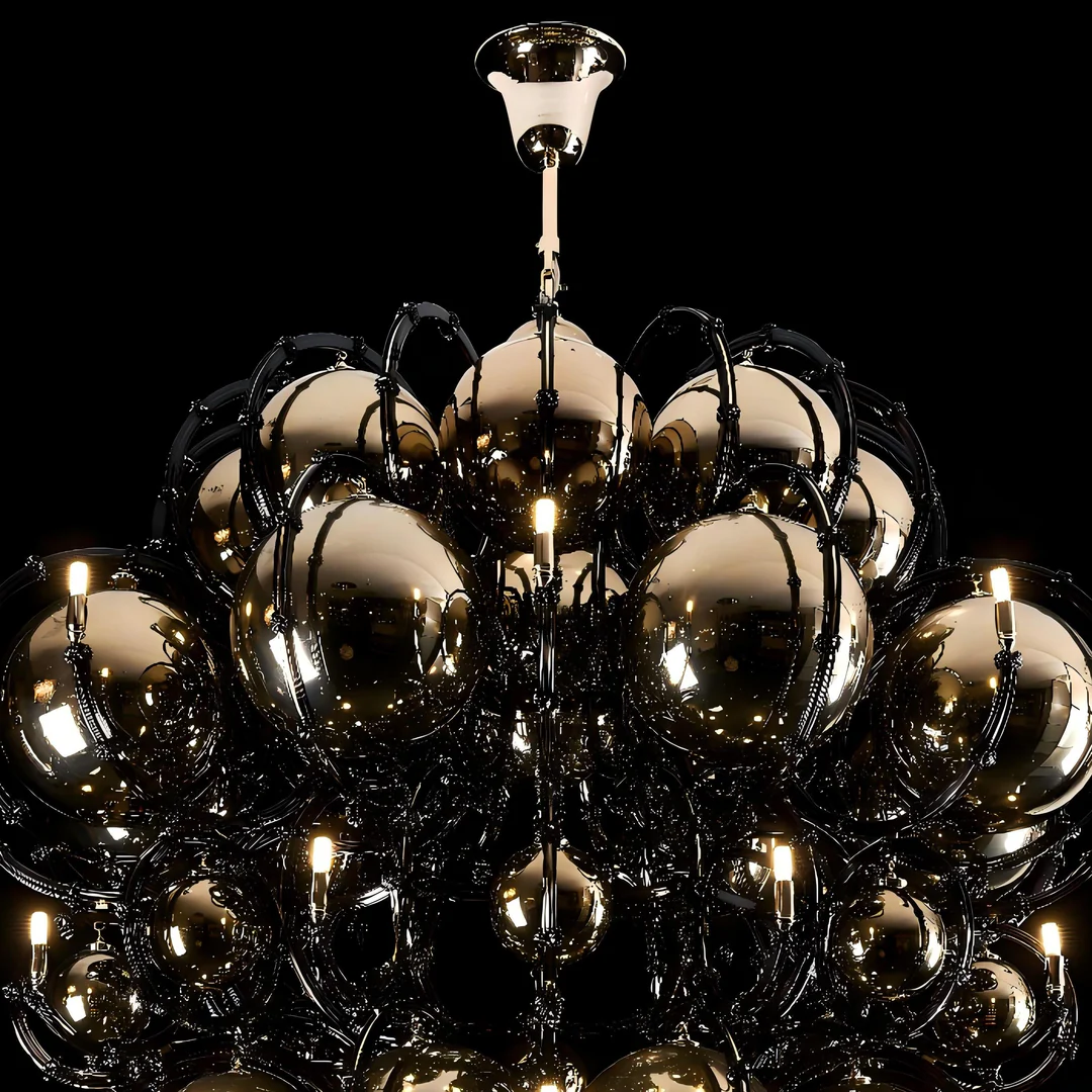 Obsidian Orbit is a bold collision of opulence and futuristic form. This sculptural chandelier assembles a constellation of glossy black chrome spheres, each orbiting around an intricate network of filigree-like branches. Embedded warm lights reflect endlessly within the mirrored surfaces, creating a hypnotic interplay of glow and shadow.